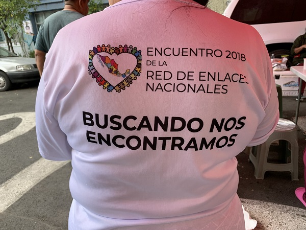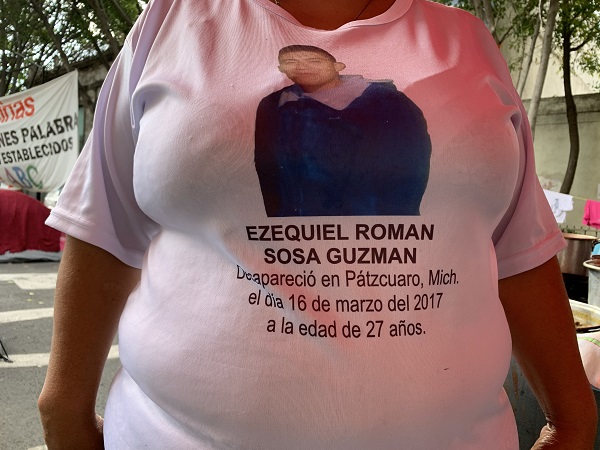 La señora Guzmán trae una playera blanca con la foto de su hijo Ezequiel Román Sosa Guzmán y un letrero: Buscando nos encontramos.