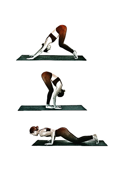 Así que aquí te presentamos variaciones a tres de las posturas básicas. La primera es Adho Mukha Svanasana o el Perro mirando abajo. En esta postura lo importante es que la espalda se alargue aunque en un inicio no podamos estirar las piernas ni bajar los talones al suelo. Para esto se deben flexionar las rodillas o levantar los talones y dirigir el pecho hacia el comienzo de los muslos, mientras se presionan las manos completa y firmemente contra el suelo para jalar las caderas hacia arriba y hacia atrás.