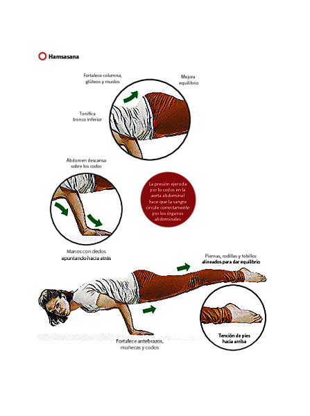 Hamsasana es una postura de equilibrio de nivel intermedio, que requiere mucha fuerza en muñecas, brazos y hombros. De hecho el foco de la postura se centra en la región del ombligo, por lo que se dice que activa y equilibra Manipura, el chakra del plexo solar donde radica el fuego de la autoconfianza, la autoestima y el poder personal. Con un chakra manipura equilibrado, “el yogui se motiva a sí mismo con metas claras y una sólida toma de decisiones”.