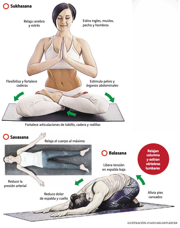 Sukhasana, la postura Fácil: Esta sencilla asana elimina el estrés y la ansiedad, también induce a la tranquilidad de la mente. Es una postura ideal para meditar, mientras concentras y enfocas tu mente.