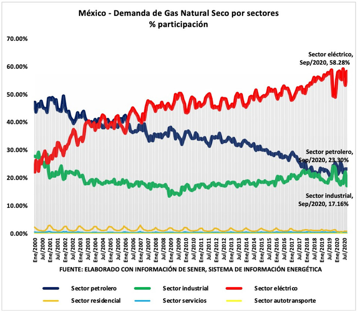 Es por todas estas ventajas que la demanda de gas natural en México ha crecido un 70% durante los últimos 13 años, pasando de 6,000 a casi 10,000 millones de pies cúbicos diarios (2007-2020). Este crecimiento (figura 1) ha sido liderado por la demanda para la generación de energía eléctrica, que ya se obtiene del gas natural en casi un 60% (tabla 2).