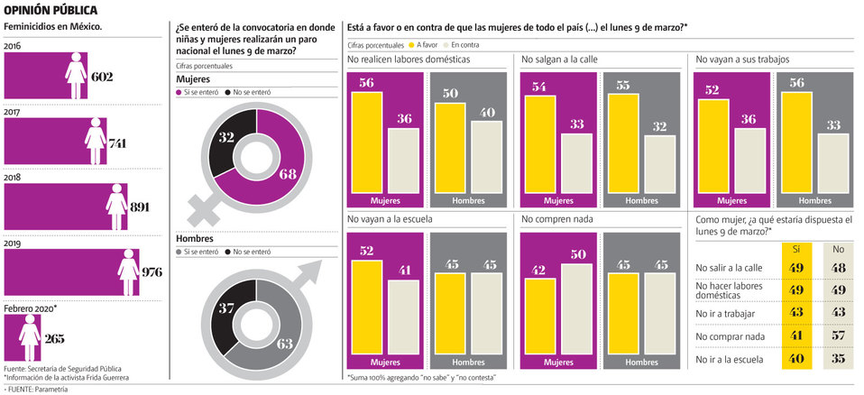 El inicio de 2020 ha significado nuevos retos para el actual gobierno en el tema de género. Las denuncias de diversas activistas (que ya registran para febrero 265 casos de feminicidios) alertan sobre el crecimiento de este fenómeno. Aunado a ello, casos como el de la joven Ingrid Escamilla y el de Fátima Aldrighett han sido especialmente sensibles para la sociedad. Por lo anterior, y a la vez que se celebra la conmemoración del día de la Mujer, el próximo 8 de marzo diversos colectivos feministas y asociaciones están convocando a una marcha de mujeres.