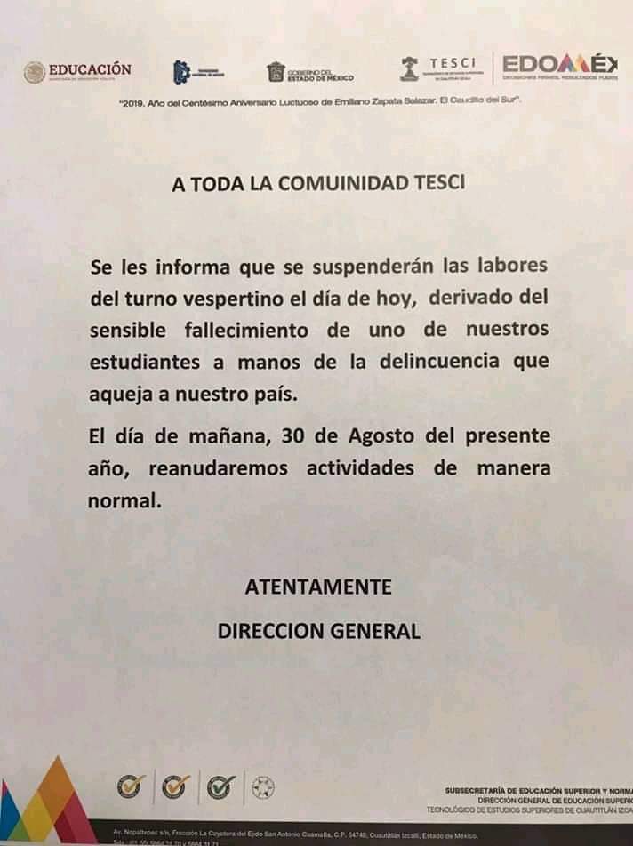 Más tarde, la dirección del TESCI, emitió un comunicado, en el cual informó a estudiantes y docentes, que se suspenderían labores en el turno vespertino, “derivado del sensible fallecimiento de uno de nuestros estudiantes a manos de la delincuencia que aqueja a nuestro país”.