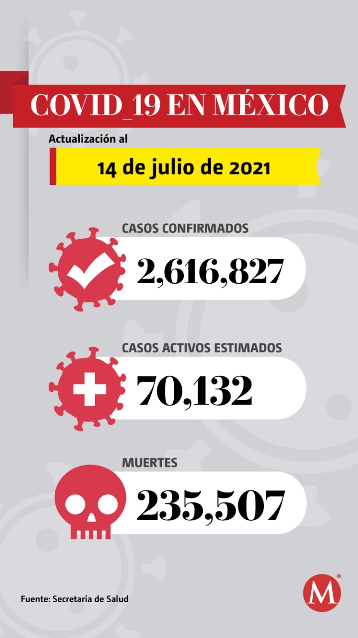 México registró 12 mil 116 nuevos contagios de coronavirus en 24 horas, para un total de 2 millones 616 mil 827 casos acumulados, así como 235 mil 507 muertes, 230 más que ayer, de acuerdo con el informe técnico de la Secretaría de Salud publicado este 14 de julio.