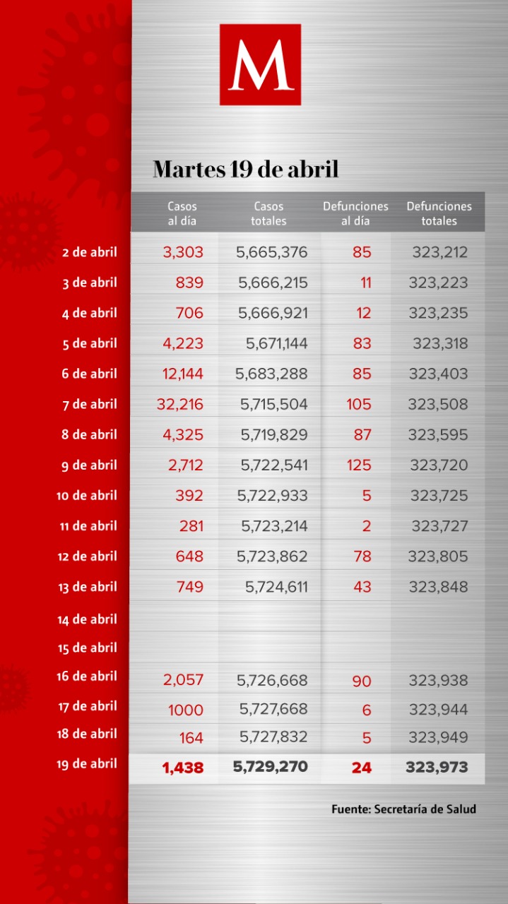 México sumó en las últimas 24 horas 24 nuevas muertes por covid-19 y mil 438 casos de la enfermedad, con lo que se acumulan 323 mil 973 defunciones y 5 millones 729 mil 270 contagios, de acuerdo con el reporte de la Secretaría de Salud.