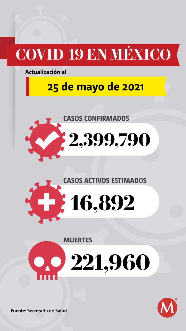 México acumula 221 mil 960 muertes por coronavirus, 265 decesos más que ayer, de acuerdo con el informe diario de la Secretaría de Salud presentado este martes 25 de mayo por José Luis Alomía, director general de Epidemiología.