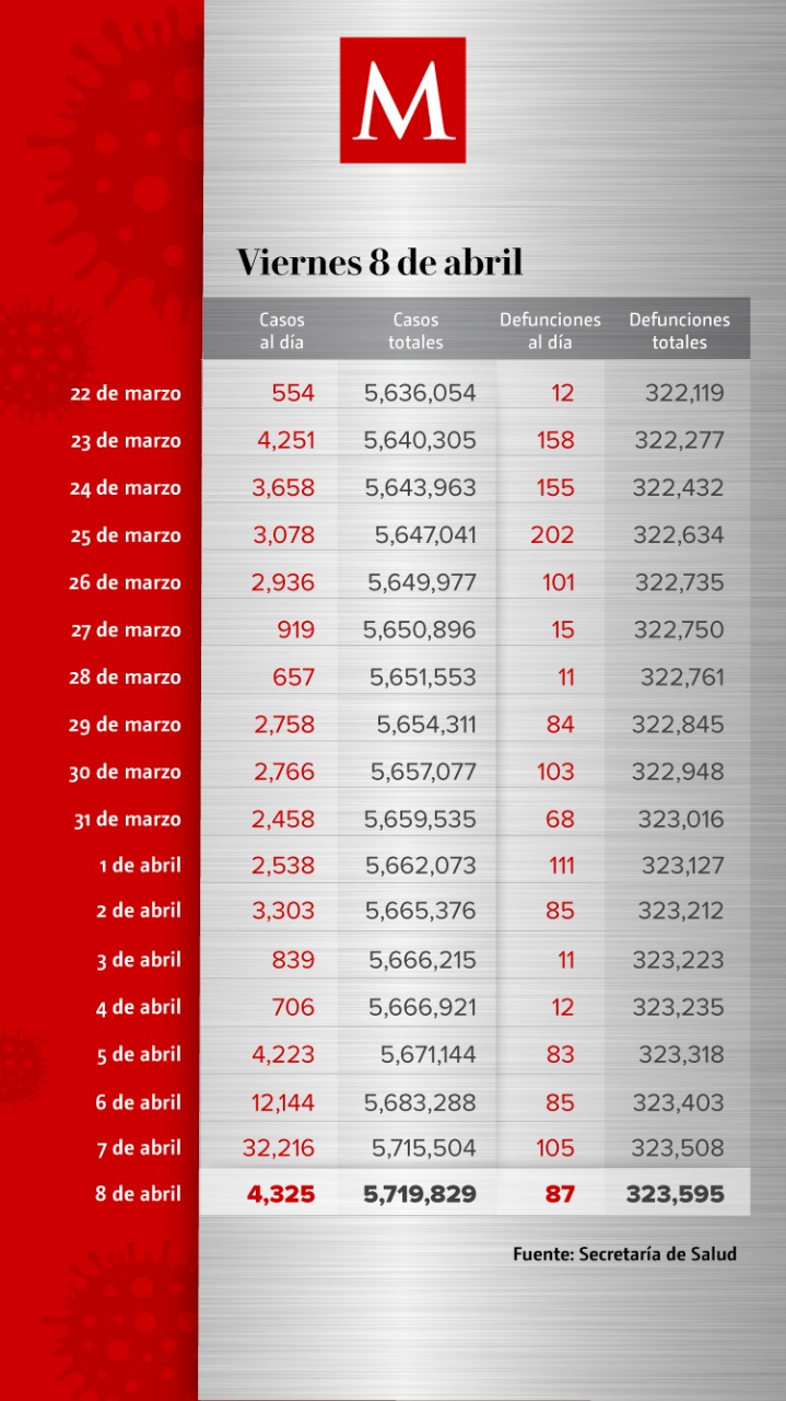México sumó 4 mil 325 nuevos casos de coronavirus y 87 muertes en las últimas 24 horas, con lo que se acumulan 5 millones 719 mil 829 contagios y 323 mil 595 defunciones, de acuerdo con el informe de la Secretaría de Salud.