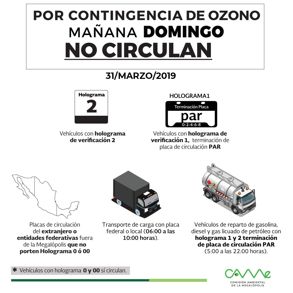 De tal forma, este domingo 31 de marzo, deberán suspender su circulación de las 5:00 a las 22:00 horas todos los vehículos con holograma de verificación 2 (vehículos de transporte); así como holograma 1, terminación de placa de circulación Par. Además de los vehículos sin holograma de verificación o con placas formadas por letras no circulan.