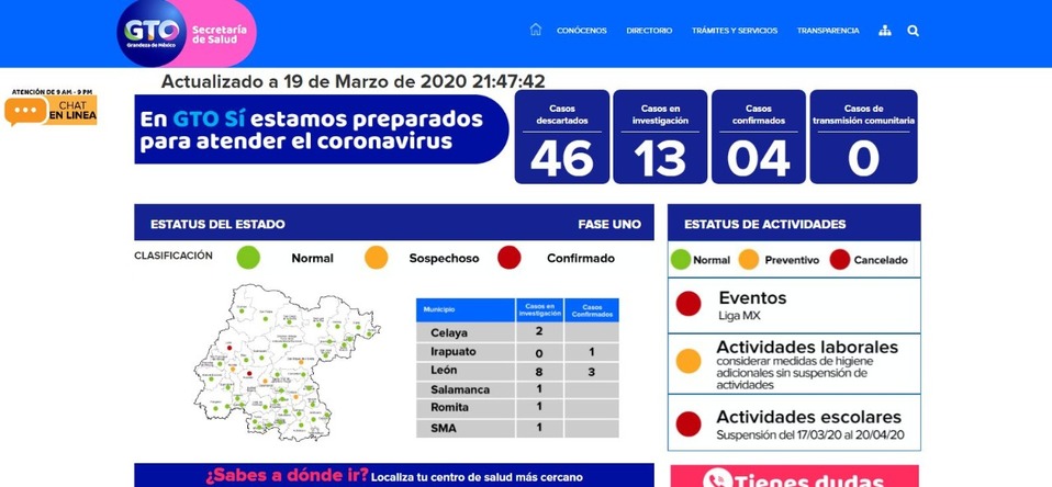 De acuerdo a información proporcionada por la Secretaría de Salud de Guanajuato, hasta el momento se reportan cuatro casos confirmados por Covid-19 en el estado, 13 más se mantienen en investigación, y han sido 46 los casos descartados.