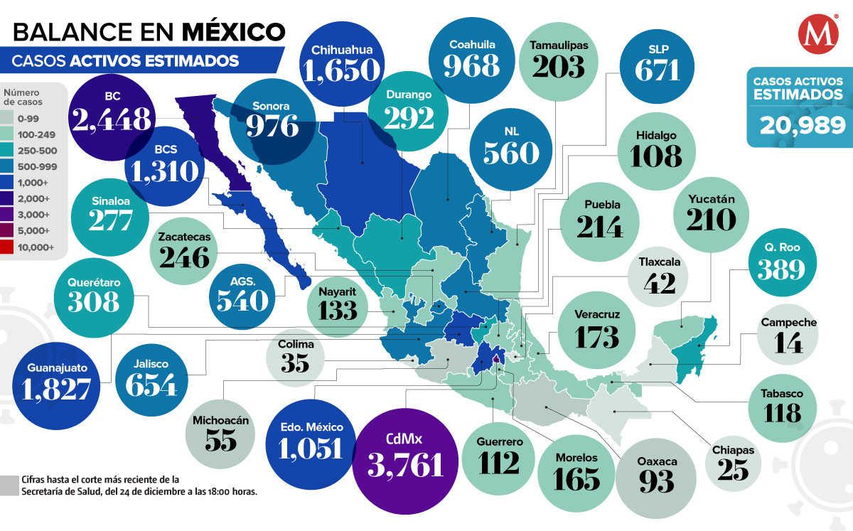 La Ciudad de México es el estado con más casos activos, con 3 mil 761; posteriormente sigue Baja California con 2 mil 448, Guanajuato reporta mil 827, Chihuahua contabiliza mil 650 y Baja California Sur registra mil 310.
