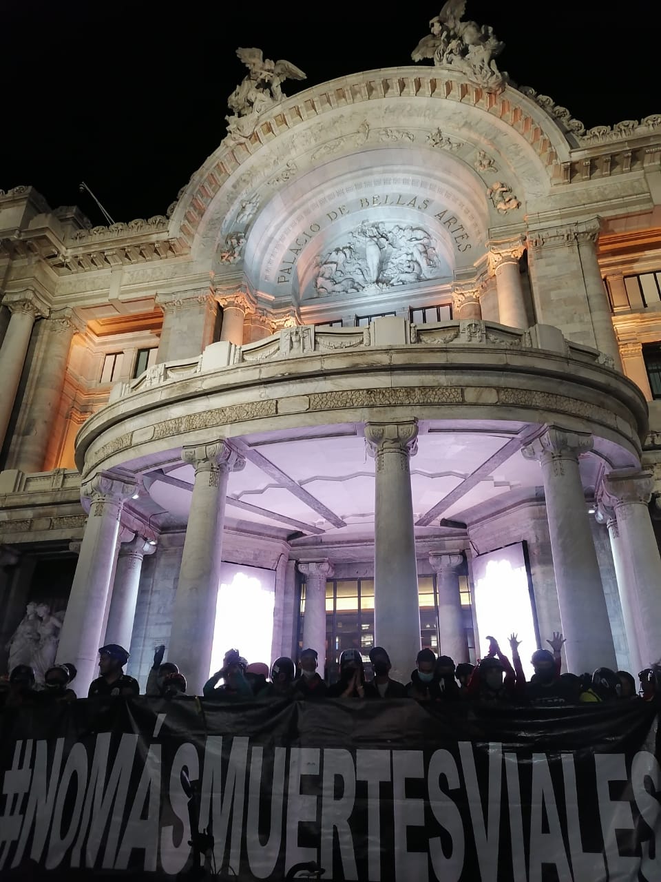 Bajo la premisa Ni una bicicleta blanca más, diversos colectivos ciclistas bloquearon el Eje Central a la altura del Palacio de Bellas Artes para pedir mayor seguridad para los ciclistas, luego de que esta mañana un automóvil arrolló a unos peregrinos que iban en sus bicicletas con rumbo a la Basílica.
