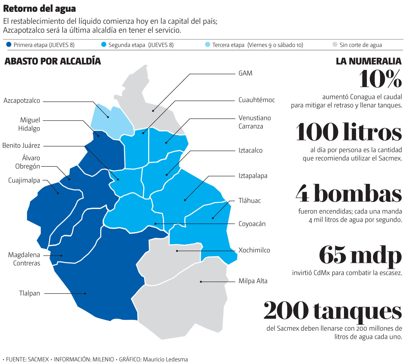 La última en recibir el líquido es Azcapotzalco. Ante ello, el alcalde Vidal Llerenas informó que tendrán 39 pipas que trabajan las 24 horas surtiendo de líquido a escuelas y hospitales, así como 58 megatinacos que tenemos instalados en diferentes puntos.