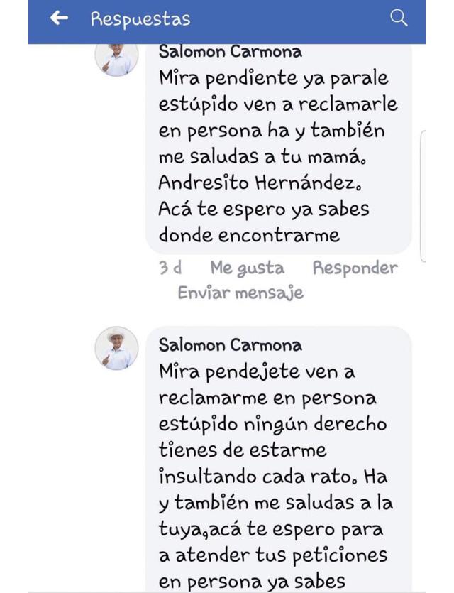 "Mira pendejete ven a reclamarme en persona estúpido, ningún derecho tienes de estarme insultando cada rato. Ha y también me saludas la tuya, acá te espero para a atender tus peticiones en persona ya sabes".