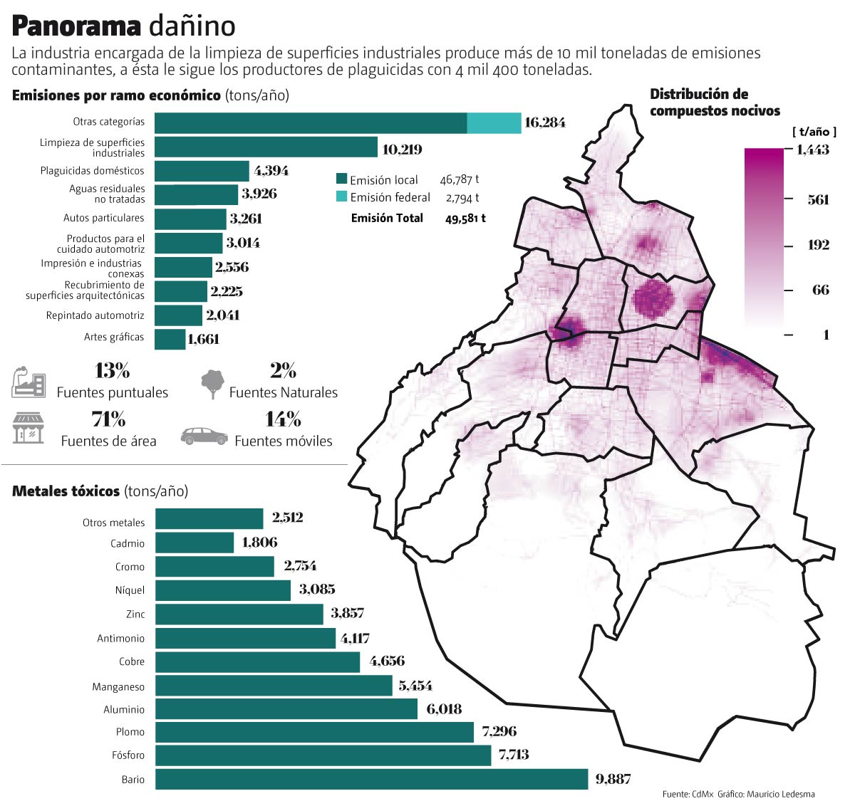 "El bario que se da por la combustión de gas natural en los sectores comercial y residencial, ya que este metal forma parte de sus emisiones; el caso del fósforo, proveniente de la resuspensión de polvos en vialidades y actividades de la construcción; y, finalmente, el plomo se genera en su mayoría por la elaboración de piezas metálicas", señala el