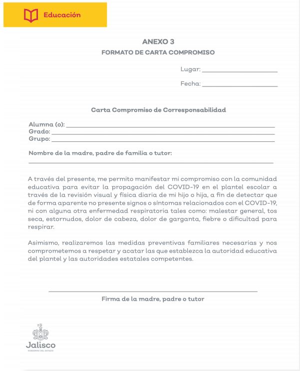 Al ingreso se vigilará que no haya estudiantes porten el cubrebocas adecuadamente y durante el primer día de clases se entregue la carta compromiso de corresponsabilidad.