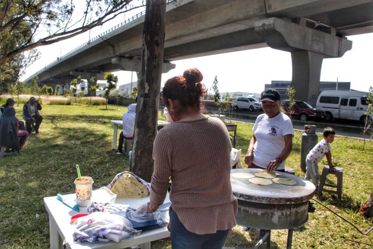 En un camellón aledaño a la empresa Volkswagen, sobre la autopista Puebla-México, esta tarde un grupo de 10 personas se instaló temporalmente para calentar comida y preparar tortillas para agarrar fuerzas y seguir su tránsito hacia la capital del país, a donde esperan llega el próximo 11 de diciembre.