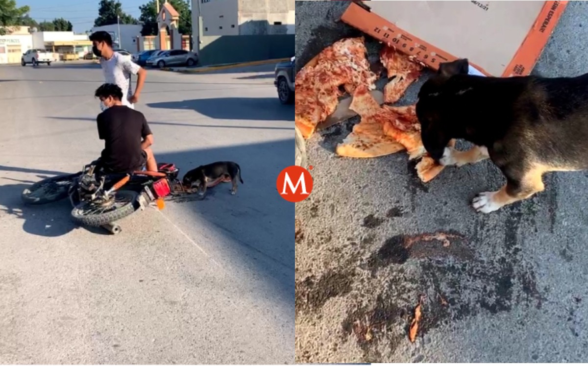 En la travesía soltaron la pizza que había comprado para comer, misma que quedó tirada en el piso junto a ellos, quien es sentados en la calle estaban esperando que llegaron ambulancia, para que los valoraran, momento que fue aprovechado por un perrito de la calle para saborear un delicioso manjar de queso y pepperoni.