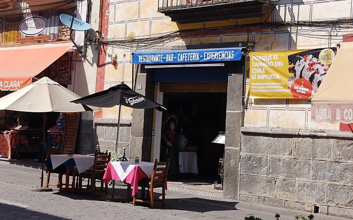 Locatarios y restauranteros que se encuentran ubicados en la calle 6 Oriente aprovechan que la calle se ha convertido en peatonal, por lo que instalan mesas y bancas afuera de sus negocios como es el caso de un restaurante de nombre "Experiencias".