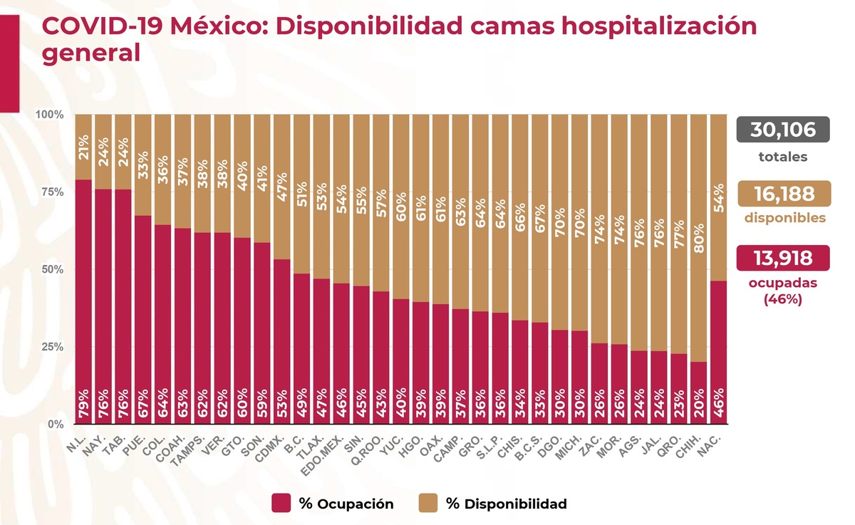 De 30 mil 106 camas para atención general, hay 16 mil 188 disponibles y 13 mil 918 están ocupadas. Los estados que presentan mayor ocupación de estas camas son: Nuevo León, Nayarit y Tabasco.