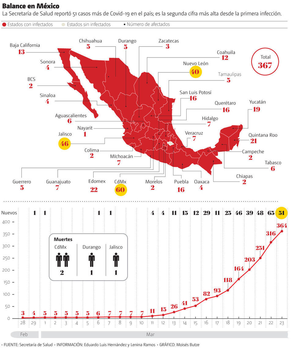 López-Gatell informó además que hay 826 casos sospechosos y 367 positivos con Covid-19 en México, de los que 292 (80 por ciento) son importados; 70 (19 por ciento) están asociados a importación y 5 (uno por ciento) carece de antecedentes de contactos o de viaje identificados.