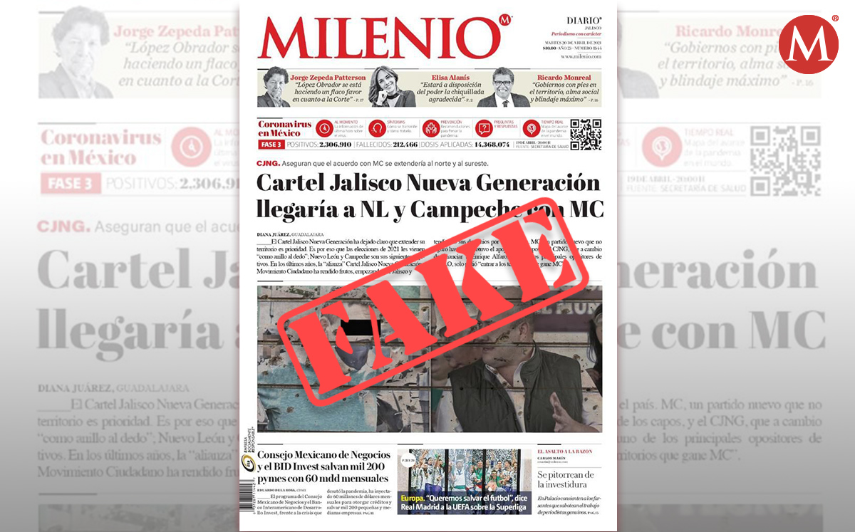 “Cártel Jalisco Nueva Generación llegaría a NL y Campeche con MC”, se lee en la imagen apócrifa en la que se usa una portada del impreso de MILENIO; sin embargo, ésta no corresponde a ninguna elaborada por esta casa editorial.