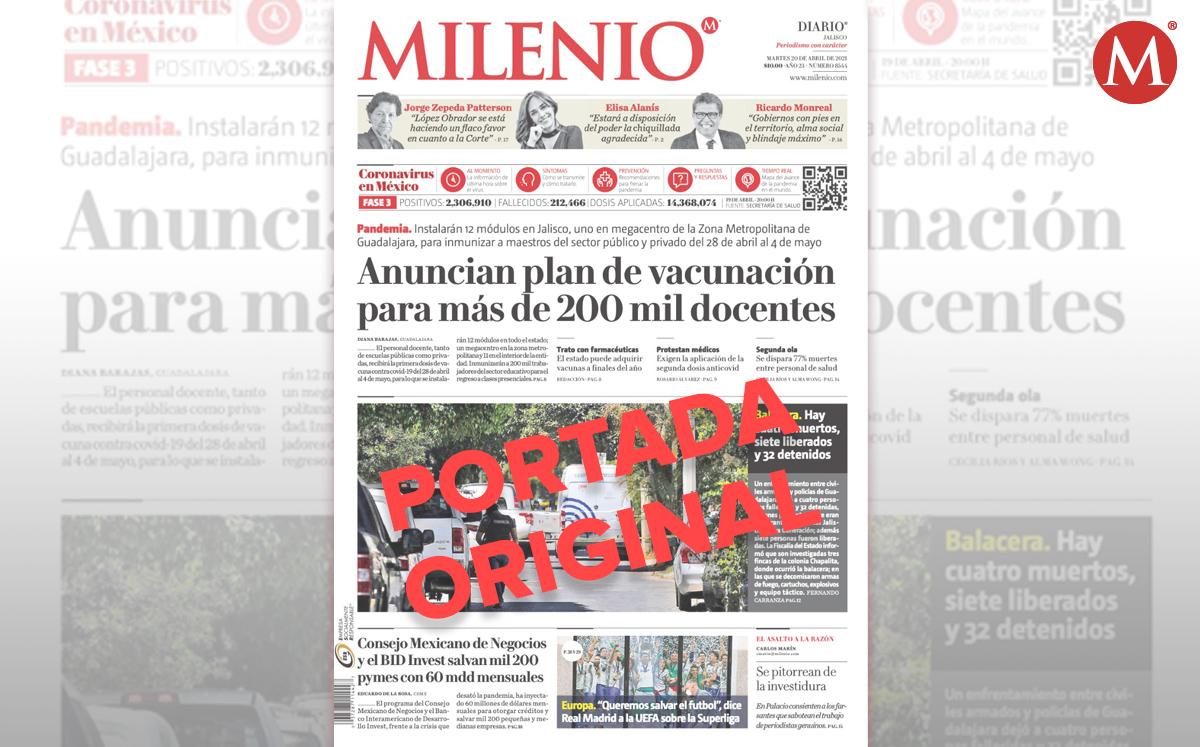 "El personal docente, tanto de escuelas públicas como privadas, recibirá la primera dosis de vacuna contra covid-19 del 28 de abril al 4 de mayo, para lo que se instalarán 12 módulos en todo el estado; un megacentro en la zona metropolitana y 11 en el interior de la entidad, inmunizarán a 200 mil trabajadores del sector educativo para el regreso a clases presenciales", dice la portada original de MILENIO.