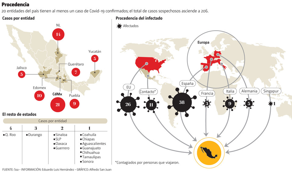 Por la noche se dio a conocer que en el país suman ya 93 casos positivos de Covid-19, de los cuales dos se encuentran graves, y hay además 206 sospechosos. Campeche sigue sin presentar ningún caso.