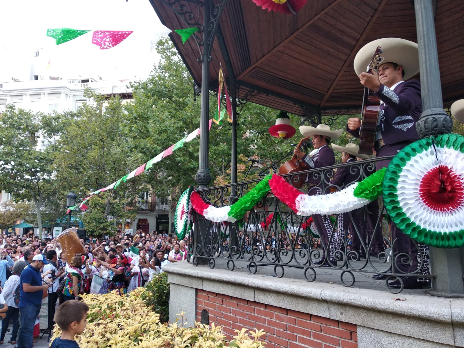Con mariachi, la comunidad mexicana que reside en Madrid festejó el Grito de la Independencia en la Plaza de Chamberí, una de las más simbólicas de la capital de España en compañía de la embajadora Roberta Lajous.