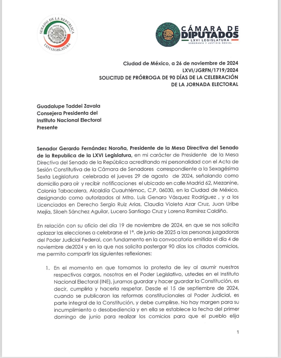 En una carta firmada por los líderes del Senado, Gerardo Fernández Noroña, y de la Cámara de Diputados, Sergio Gutiérrez Luna, y dirigida a Guadalupe Taddei, consejera presidenta del INE, se explicó que desde el 15 de septiembre del 2024, cuando se publicaron las reformas constitucionales al Poder Judicial, es parte integral de la Constitución y debe cumplirse.