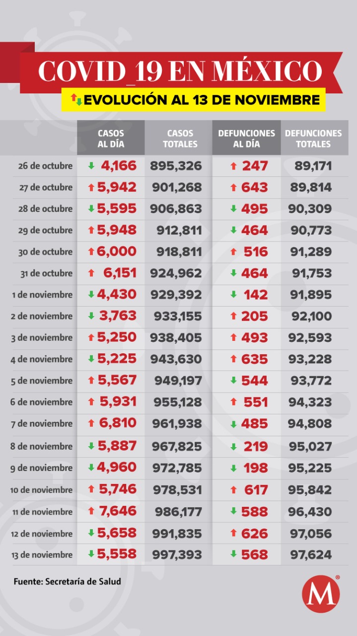 Autoridades de la Secretaría de Salud dieron a conocer las cifras de la pandemia de coronavirus en México al 13 de noviembre, reportando: