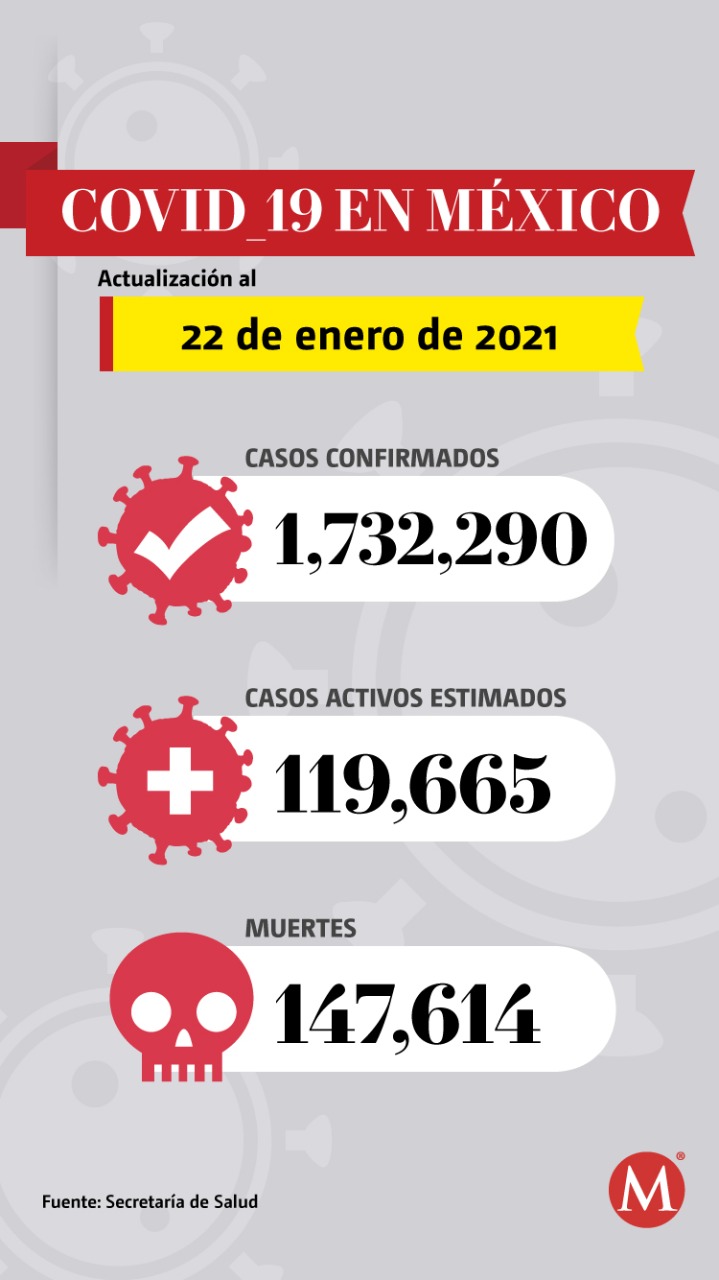 México registró mil 440 nuevas muertes y 21 mil 7 nuevos casos de covid-19 este viernes, de acuerdo con el reporte de la Secretaría de Salud que dio a conocer las cifras de la pandemia en el país al 22 de enero.