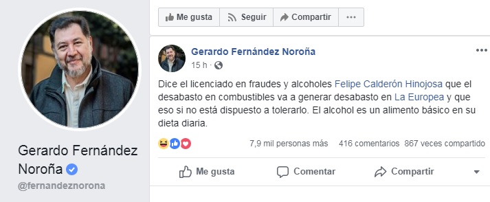 "Dice el licenciado en fraudes y alcoholes Felipe Calderón Hinojosa que el desabasto en combustibles va a generar desabasto en La Europea y que eso si no está dispuesto a tolerarlo. El alcohol es un alimento básico en su dieta diaria", escribió Noroña en su cuenta de Facebook.