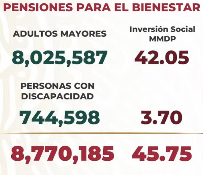 En total, se entregará el apoyo a 8 millones 25 mil adultos mayores, que, en conjunto con los apoyos a personas con discapacidad, sumarán un total de 46 mil millones de pesos para las pensiones. Asimismo, la Secretaría de la Defensa Nacional (Sedena) y Marina (Semar), así como la Guardia Nacional colaboran en la distribución de los recursos.