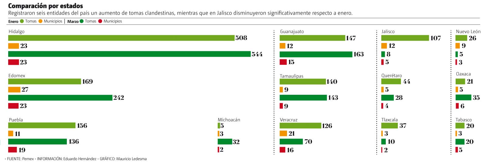 El Estado de México vivió, por su lado, un incremento sustancial en el número de ataques a ductos. Si en enero reportaba 169 casos en 27 localidades, para marzo registraba 242 tomas en 23 municipios.