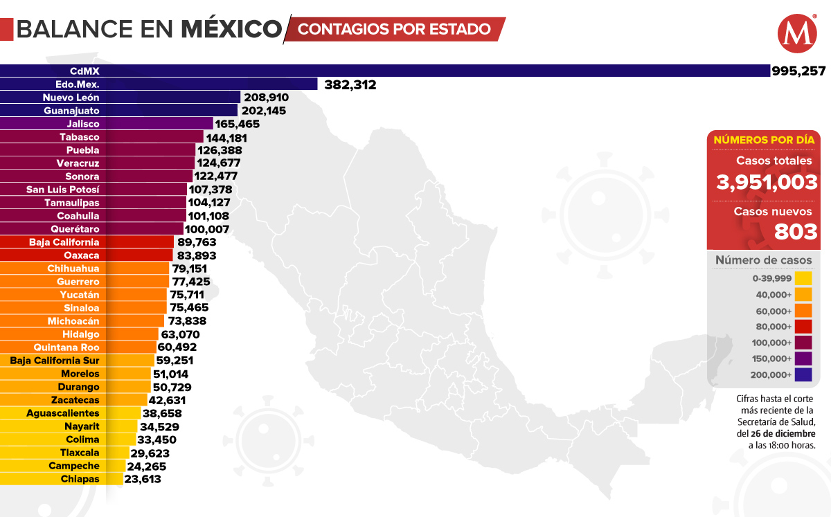 La capital de la República registra 995 mil 257 casos acumulados, en el Estado de México hay 382 mil 312, Nuevo León reporta 208 mil 910, Guanajuato contabiliza 202 mil 145, y Jalisco tiene 165 mil 465.