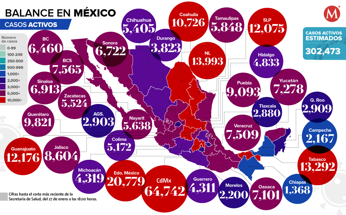 En Ciudad de México se estiman 64 mil 742 casos activos, el Estado de México tiene 20 mil 779 contagios, Nuevo León contabiliza 13 mil 993, Tabasco reporta 13 mil 292 y en Guanajuato hay 12 mil 176.