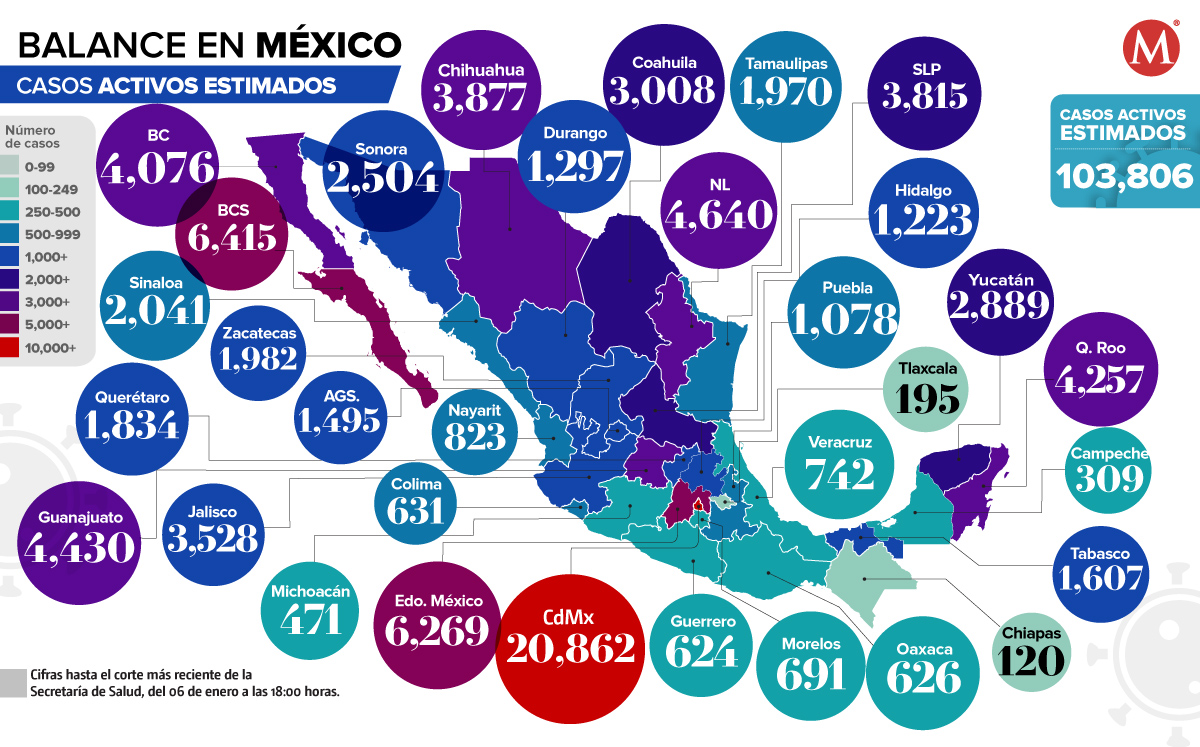 En Ciudad de México se estiman 26 mil 862 casos, Baja California Sur reporta 6 mil 415, Estado de México tiene 6 mil 269 contagios, Nuevo León contabiliza 4 mil 640, y en Guanajuato hay 4 mil 430.