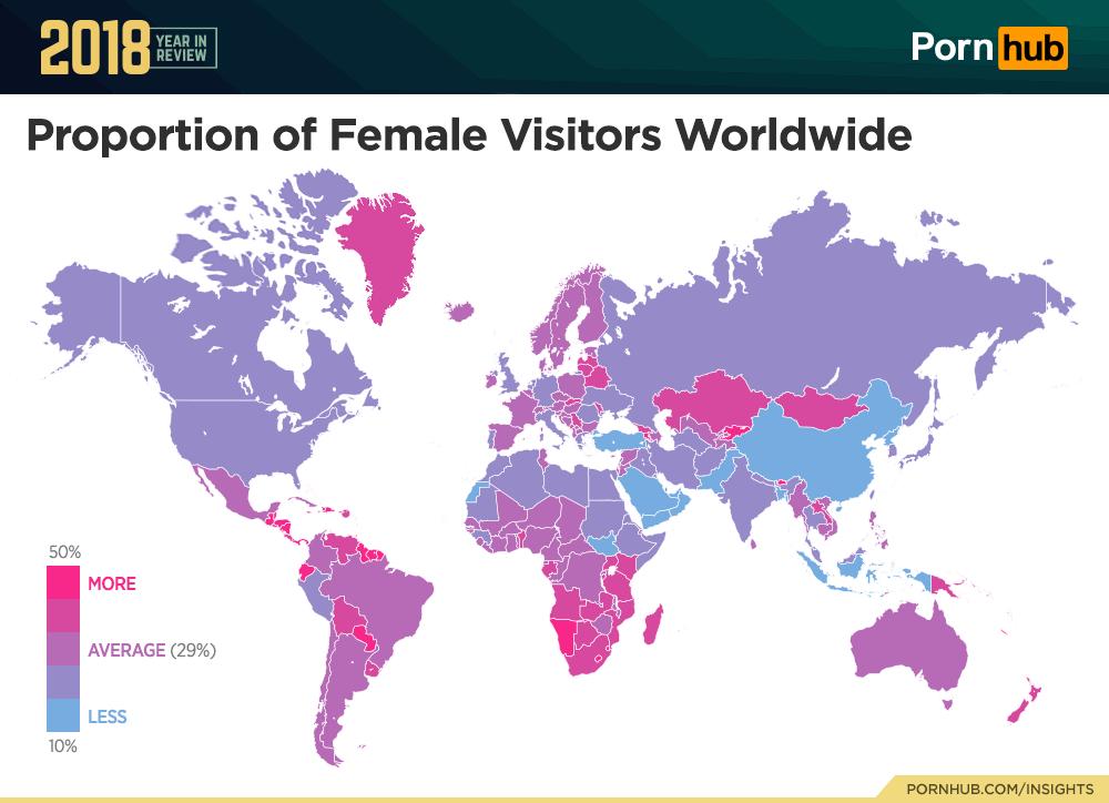 El porcentaje de mujeres mexicanas que ven Pornhub se posicionó ligeramente por encima del promedio, que es 29 por ciento. Países como Canadá, Argentina, España o Italia tienen esta cifra.