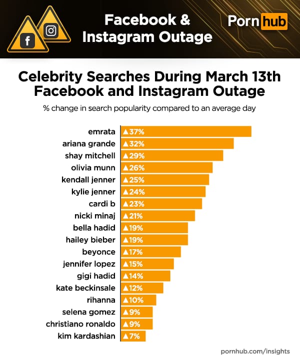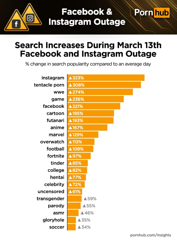 The moment you were waiting for. Traffic to Pornhub spiked 19% while @instagram and @facebook were down yesterday! pic.twitter.com/760pdvsnUE